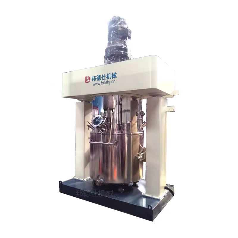 行星攪拌機是一種新型高效無死點混合攪拌設備。它具有獨特、新穎的攪拌形式。釜內有兩根或三根多層漿葉式攪拌器和一至兩個自動刮刀,攪拌器在繞釜體軸線公轉的同時,又以不同的轉速繞自身軸線自轉,使物料在釜體內作復雜的運動,受到強烈的剪切和搓合。此外設備內的刮壁刀繞釜體軸線轉動,將粘在壁上之物料刮下參于混合,使其效果更為理想。釜體采用特殊密封結構,可進行加壓及抽真空,具有良好的排氣除泡效果。缸體夾套可根據用戶需要進行加熱、冷卻。出料方式為壓料式,設備缸蓋可液壓升降,缸體可自由移動,操作十分方便。而且攪拌槳及刮刀可隨橫梁上升而完全脫離缸體,便于清潔。